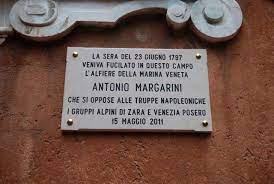 Un episodio mi ha colpito, in particolare. Quello sul quale mio padre ebbe a scrivere un racconto commovente. Quello di Antonio Margarini, o Mangarini, un giovine soldato di Dalmazia al servizio di Venezia, congedato dalla neutrale Serenissima all’arrivo dei giacobini. E fucilato per aver partecipato alla rabbiosa insurrezione popolare del 12 maggio 1797, quando il popolo veneziano, alla notizia della resa del Maggior Consiglio alle volontà degli invasori, si diede a bruciare e saccheggiare case e beni dei collaborazionisti giacobini.