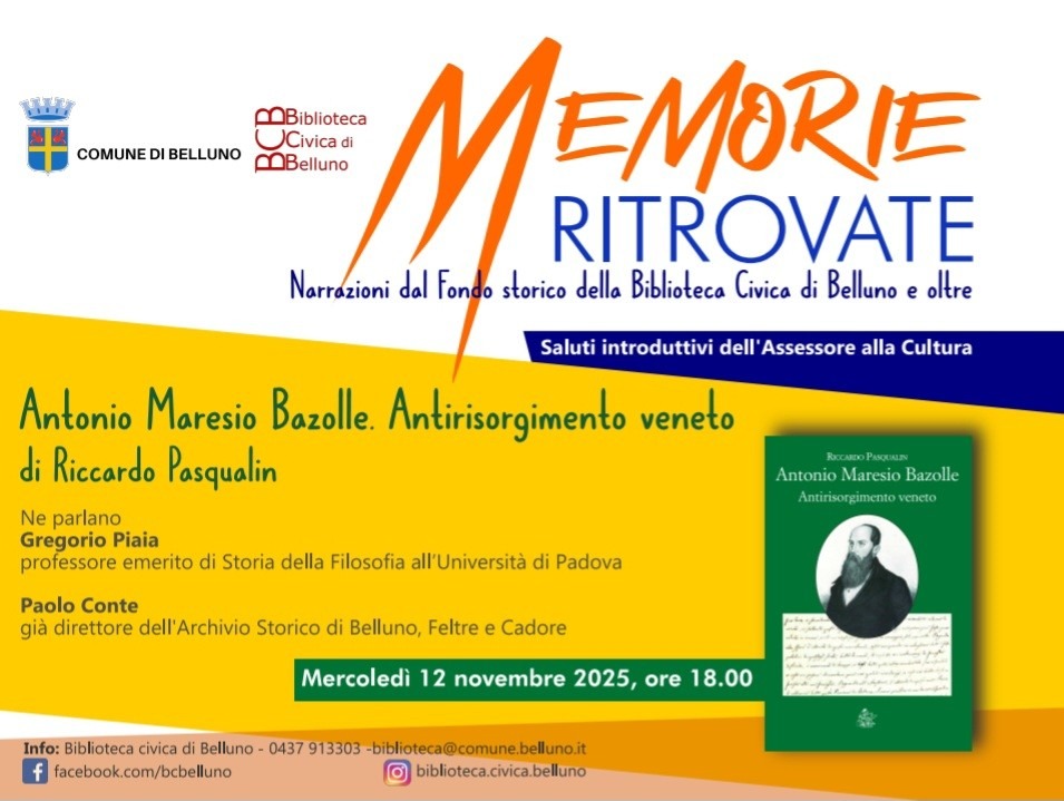 Mercoledì 12 novembre 2025, alle ore 18, presso la Biblioteca Civica di Belluno, a Palazzo Crepadona (Via Ripa 3) lo studioso Riccardo Pasqualin presenterà il suo nuovo libro “Antonio Maresio Bazolle. Antirisorgimento veneto” (edito quest’anno da Club di Autori Indipendenti), una ricerca che restituisce voce e giusto rilievo al più importante memorialista dell’Ottocento bellunese.