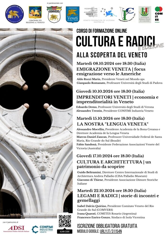 Associazione Veneti nel Mondo propone da martedì 8 ottobre 2024 la seconda edizione del percorso formativo online “Cultura e radici. Alla scoperta del Veneto” realizzato grazie al contributo della Regione del Veneto.
