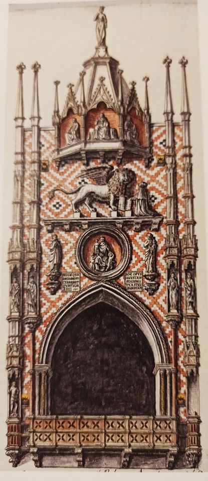 “Palazzo Ducale, facciata sul Molo, su mensola sopra il balcone grande gruppo scultoreo composto dal doge Michele Steno genuflesso dinnanzi al leone marciano andante a destra reggente libro aperto, altorilievo di Jacobello e Pierpaolo Dalle Masegne datato, nel balcone, al 1404 …L’opera fu distrutta nel 1797 e, a differenza di quella già sulla piazzetta, non fu ricostruita, nonostante fosse già stato approvato un modello dello scultore Gerolamo Bortotti.”