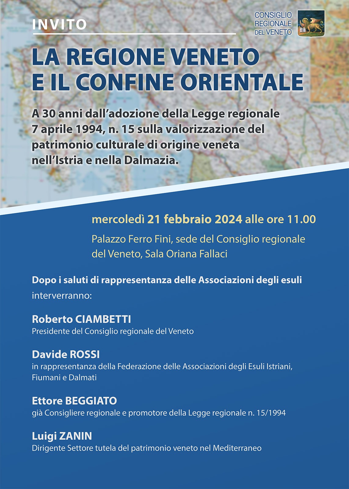Al convegno di palazzo Ferro-Fini a Venezia sulla Legge Beggiato parteciperanno il Presidente del Consiglio Regionale del Veneto, Roberto Ciambetti, ed Ettore Beggiato, che da assessore regionale all’identità veneta nel 1994 riuscì a far approvare quella legge che da allora porta il suo nome. Interverrà anche Luigi Zanin, dirigente regionale del settore “Tutela del patrimonio veneto nel Mediterraneo” che materialmente cura l’applicazione della Legge Beggiato. E sarà presente Davide Rossi, in rappresentanza della Federazione degli Esuli Giuliani, Fiumani e Dalmati.
