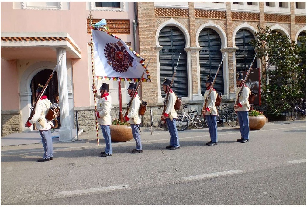 I figuranti in divisa imperiale austriaca hanno potuto sfilare bravamente, con i loro lunghi fucili a baionetta e issando la bandiera imperiale d’Asburgo, davanti all’Hotel Excelsior. A loro fu permesso di sfilare e di rendere gli onori alla bandiera, fu permesso di entrare dalla porta principale senza umiliarli in attese pazzesche e senza prescrivere divieti fantasiosi e inattuabili come il divieto di fotografia alla Mostra del Cinema.