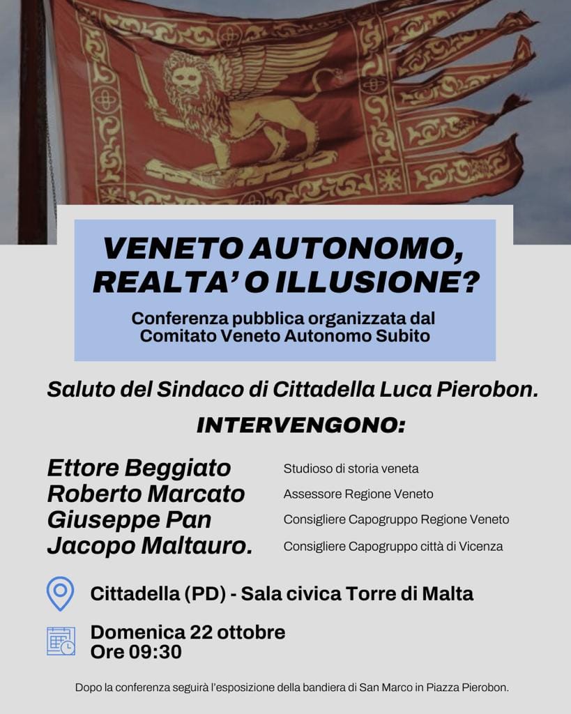 Alla Conferenza di Cittadella interverranno Ettore Beggiato, studioso di storia veneta e protagonista indiscusso della Questione Veneta; Roberto Marcato, assessore regionale e battagliero difensore dell’autonomia veneta anche all’interno della stessa Lega “italiana” di Salvini; Giuseppe Pan, capogruppo della Lega nel Consiglio regionale del Veneto, e “padre” della Lega cittadellese: e Jacopo Maltauro, capogruppo Lega in Consiglio comunale a Vicenza, e promotore due anni fa, in occasione dei 1600 anni di Venezia, di una manifestazione a Vicenza con onori alla bandiera della Serenissima.