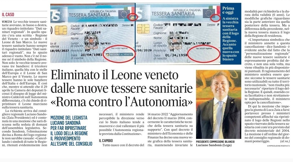 Dal 1 marzo 2022 le nuove tessere sanitarie in distribuzione nel Veneto non hanno più il Leone di San Marco. Un decreto ha cancellato dalle tessere sanitarie tutti i simboli e i nomi delle Regioni, che pure sono l’ente che gestisce il servizio sanitario. Sulle tessere, ora, compare solo il Tricolore italiano e la bandiera stellata dell’Unione Europea. Le Regioni sono state “cancellate” per decreto.
